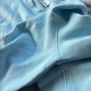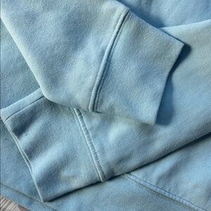 Sky blue Columbia sweatshirt with front logo design. Comfortable and stylish. Worn and washed (hung to dry) only a couple of times. Very light stain at the bottom back of sweater. I have not tried stain remover so it might be able to be washed out.