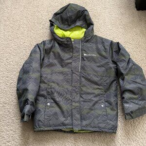 Gray and green full-zip insulated child's Columbia jacket with velcro grip over zipper. Includes insulated green snow overalls with velcro adjustment at shoulder.