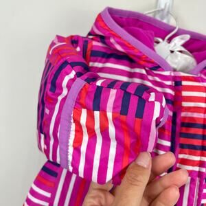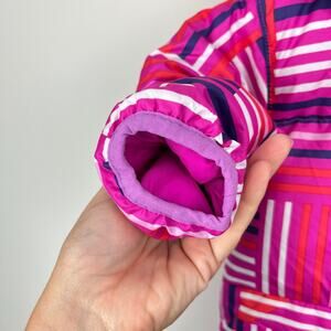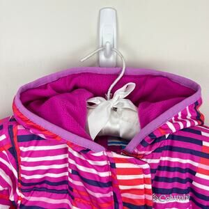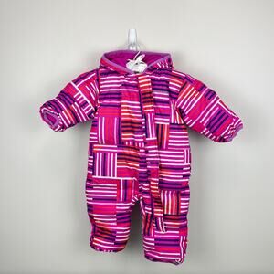 Columbia Snuggly Bunny Bunting Down Snow Suit. Baby girl size 3-6 months. Cozy and warm one piece snowsuit. Features fixed hood, plush down insulation, long zipper for easy on/off, fleece lined hood and upper body, and fold over hands and feet to lock in body heat. Fun patchwork style pattern with pink, white, purple, and red stripes. Excellent condition!