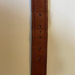 This belt is in pre-owned condition. There is an extra hole due to sizing fluctuations , some light scratches on the leather and some discoloration. The belt has some curve to it from wear. Please see the photos for measurements and condition. Beautiful sturdy belt.