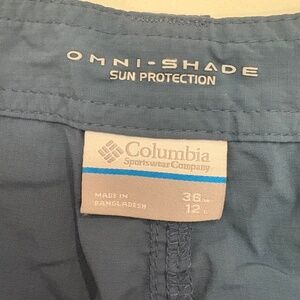 Good used condition men’s omnishade sun protection shorts, made by Columbia Sportswear. Dark blue, 12” length, waist 36”.
