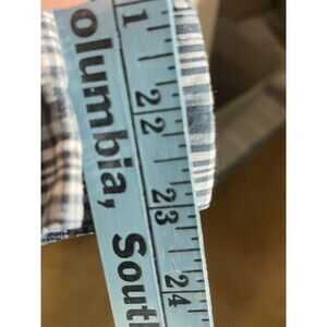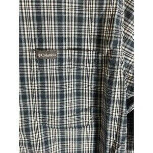The product is a Columbia Sportswear men's size large green plaid shirt, featuring a button-up style with long sleeves. Made of cotton knit fabric, this shirt is designed for outdoor themes and casual wear. The brand, Columbia, is known for its quality and outdoor-inspired clothing, making this shirt a stylish and practical choice for any man's wardrobe.