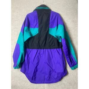 This Columbia 90's Vintage Snow, Rain, Ski Jacket Size Large is a unisex mid-length Activewear jacket with a black, Green and Purple nylon outer shell and features a 1/2 zip Button up Pullover closure, Mock Neck Zip Up collar, Lots of Zip Up Pockets and a Drawstring Waist and Hidden Hood, this versatile jacket is Great For all Active, Outdoor Cool Weather Adventures with a regular fit. It offers functionality for various activities like walking, skiing, hiking with water-resistant and breathable properties, making it ideal for all seasons in winter, fall, and spring.