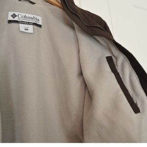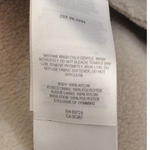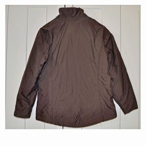 Warm but not bulky, comfortable. Excellent barely-used condition. 2 side slit pockets w/ zippers, inner cell phone chest pocket w/ Velcro. WL3094. Machine wash cold, tumble dry. Chocolate exterior nylon – not soft but not crunchy. Tan interior fleece soft polyester. Chest width at underarms 21-1/2. Length in back from neck to hem 26-1/2. Flattering princess seams front & back, underarm panel for comfort and flexibility. Flat hemline (not elastic) with slight tail dip. Smoke-free.