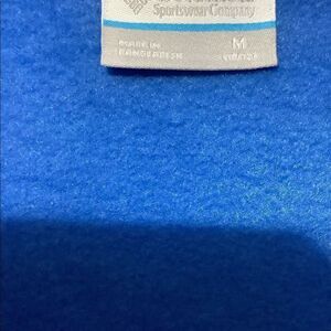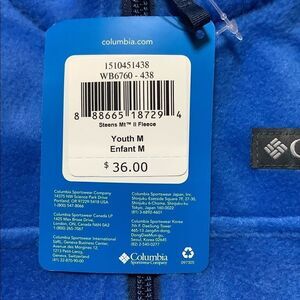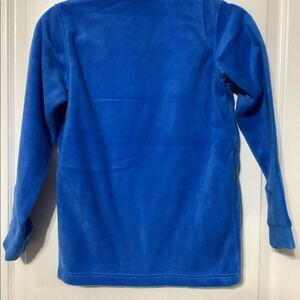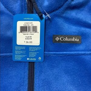 Beautiful blue colored full front zipper jacket by Columbia. The tag says youth / infant size, but it is only youth medium size. It has full front zipper with pockets. Very warm and soft fabric. It is unisex for either boy or girl.
