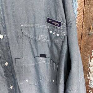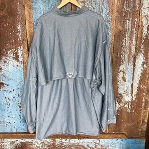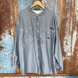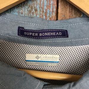 Here is a nice Columbia Super Bonehead Button Down Fishing Shirt size 5X. It is in great used condition with minimal signs of wear. Measurements are approximately 36 inch length, 24.5 inch sleeves and 33.5 inch width when flat.