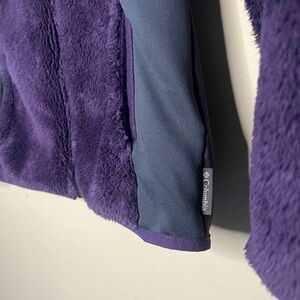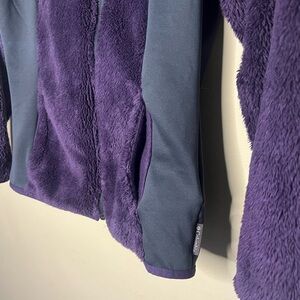 Super plush fleece with a high pile. Zippered breast pocket and two side pockets. Contrasting dark paneling on the jacket for a flattering fit. Size small.