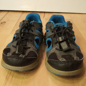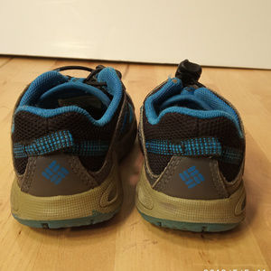 Children's Supervent Closed Toe Mesh Water Sandal. Pre-owned kids toddlers Columbia Supervent Sandals / Water Shoes. These have wear on them, please see pictures. On both shoes there is wear at the front of the collars, see close up picture. Minimal discoloration on soles and mudguards. Lots of tread left on soles. Model: bc4564-010. Color: blue/black/gray.