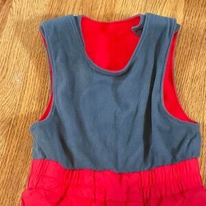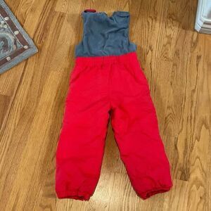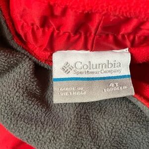 Size 4T. Columbia brand. Fleece bodice is adjustable with Velcro at the shoulders. The legs zip all the way around for toileting or diaper changes. The bottom is fleece lined. Very nice. Elastic waist and ankles. The red and gray could work for a girl or boy. Fast shipping!