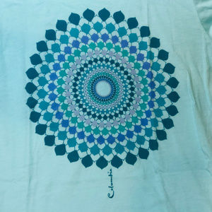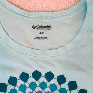 Columbia T Shirt peacock feather circular design, short sleeve, seafoam blue/green, size small. Very comfy, worn gently.