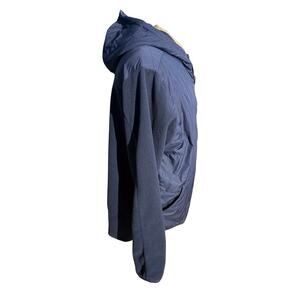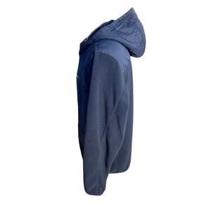 Columbia Men’s XL full-zip hybrid jacket featuring Omni-Heat Thermal Coil lining for advanced warmth. Navy blue color with insulated quilted front, fleece sleeves and back, and attached hood for extra coverage. Lightweight yet warm, perfect for cool-weather hiking, travel, or everyday wear.