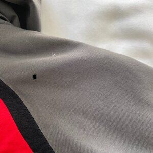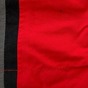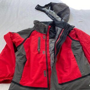 Classic Boy's Winter Jacket in gray with red trim. Can be worn three ways. The outer layer jacket is waterproof, windproof and breathable. The inner layer is a warm fleece which is zipped in and secured at three points. These can be worn separately or together for the ultimate in warmth and comfort. Other features include a removable, lined hood; a reflective thermal liner; adjustable cuffs; fleece-lined pockets; zippered hand pockets; and goggle and media pocket. Easy care, machine washable and dryable. Chest measurement taken flat across armpits 19", Length from Shoulder to Hem 23", Sleeve Length 19". In Good Preowned Condition with the exception of two blemishes illustrated in the last two photographs: A tiny burn hole from a campfire near the back shoulder, and a tiny dark dot near the back hem which may come out with stain remover. Pricing reflects these two slight defects.