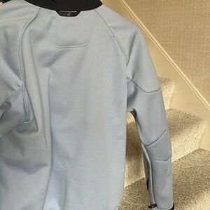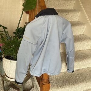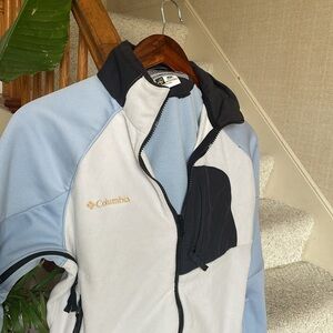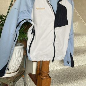Stylish Columbia jacket in light blue cream and black. Perfect for outdoor adventures and layering. multiple pockets, arm vents, velcro cuffs , waist tightening on each side, super cute and flattering . Great pre loved condition size large by Columbia