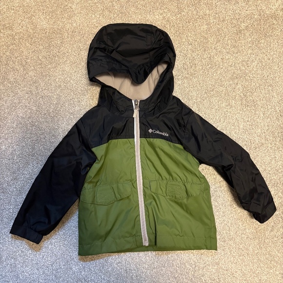 Gently used Columbia Sportswear Company toddler boy rain jacket with hood, size 2T, colors black and green.