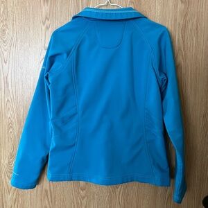 This is a great jacket in a beautiful turquoise color. It’s thick and warm, full front zip. Size small.