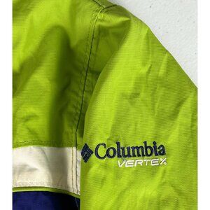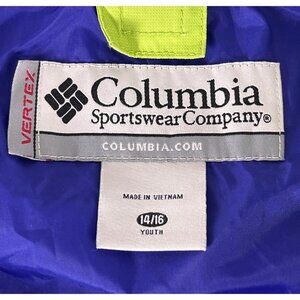 The Columbia Vertex Snap Front Zip Ski Jacket for Girls in size 14-16 Youth is a durable and stylish winter coat designed for outdoor activities. Featuring a vibrant green and blue colorblock design, this jacket is both eye-catching and functional. It has a snap front and zip closure for secure protection against the cold, making it perfect for skiing or snowboarding. The insulated fabric provides warmth while maintaining breathability, ensuring comfort during winter adventures. Ideal for keeping young outdoor enthusiasts cozy in colder conditions.