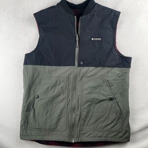 Columbia Vest Men M Black Green Reversible Fleece Plaid Lined Full Zip Hike Fish