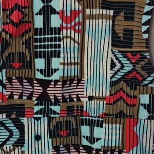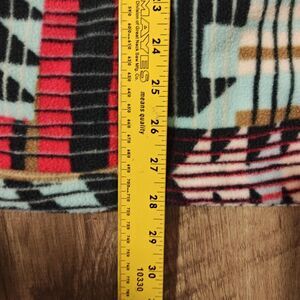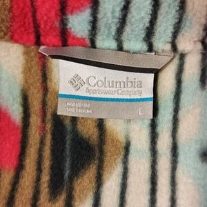 Features a bold multicolor retro Aztec geometric print in tan, turquoise, black, red, and cream. Full zip front closure, stand collar, and zippered hand pockets. Soft fleece exterior for warmth and comfort. Columbia embroidered logo on chest. Interior lined in smooth fleece with pocket details.