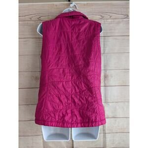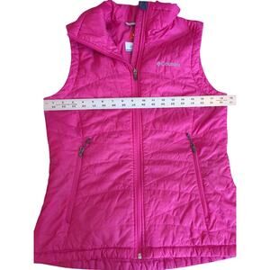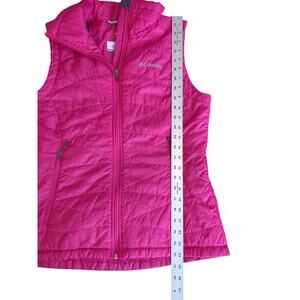 This Columbia Vest is designed for women in a size Medium. The outer shell material is polyester in a stylish pink color, featuring a quilted design and a full zip closure. It is a sleeveless puffer jacket with a mid-length fit, perfect for winter, fall, or spring seasons. The vest is insulated with Columbia Omni Heat technology, making it suitable for outdoor activities. With a collared neckline and a regular fit, this vest combines functionality with a colorful and classic outdoor theme.