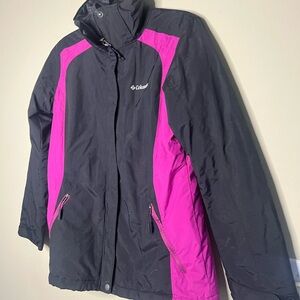 Black with pink accents. Zippered pockets and full zip with Velcro fastenings down the front. Insulated. Waterproof design with nylon lining and outer. No flaws. Worn a handful of times.