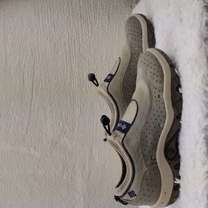 Columbia Watusi Women's Grey Blue Detail Fabric Toggle Pull Upper Round Toe Low Top Slip On Omni Grip Sole Water Training Shoe. Upper Toe Spot/Heel. Light Sole Grit Per Picture. Light Footbed Wear. Size 8 Medium. Color May Vary Due To Lighting.