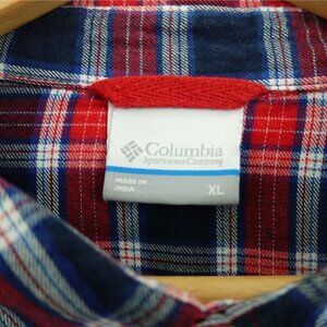 Description: Columbia men's XL flannel shirt in a bold red and navy plaid pattern. Features dual button-flap chest pockets and a unique western-style shoulder yoke on both the front and back. Super soft brushed fabric makes this a cozy yet rugged option for cold weather or casual wear. Great for layering during hiking trips or outdoor adventures.