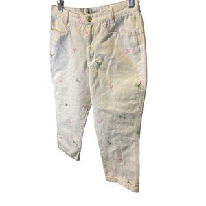 Columbia's white, summer cropped pants in size 6, featuring a fun palm tree and flamingo embroidery. Made from premium quality cotton, these pants are perfect for a stylish summer look.
