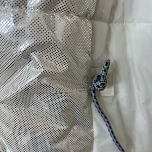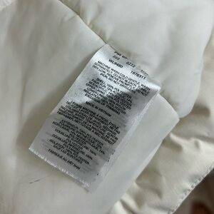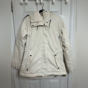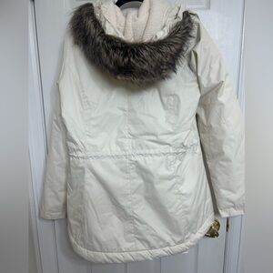 Great jacket in used condition. Very warm, water resistant. Great for snow. Because it is white, the sleeves and the back are a little dingy. Item has been washed and cleaned thoroughly though! Faux fur on hood can be removed. I ended up needing smaller, so hoping to pass on to someone who will love and use it!
