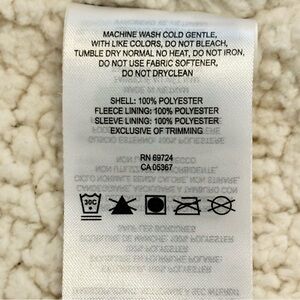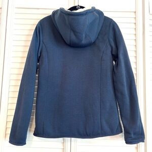 Description: Navy blue full zip jacket with a hood and off-white faux sherpa lining. Women’s size medium.