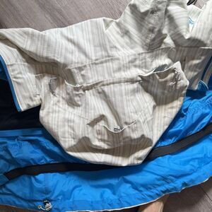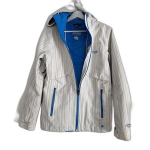 Design and Features: It's a hooded jacket with a full-zip closure and a distinctive striped outer shell. The blue lining suggests it might be part of an "Interchange" system, allowing for the inner and outer layers to be worn together or separately, though this specific model is not explicitly identified as a 3-in-1.