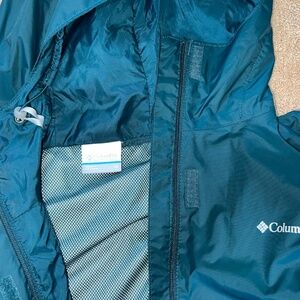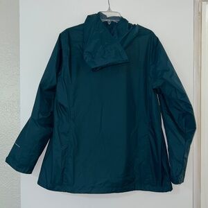 Only worn a handful of times. Light and can easily be folded up to fit into a bag. Breathable material with mesh interior lining. Drawstrings on the bottom for an adjustable size. Pockets and hood included. Retails for $75
