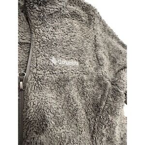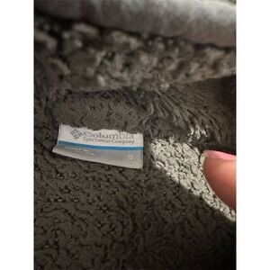 Keywords: Columbia jacket, women's fleece, black jacket, cozy outerwear, fall fashion, casual jacket, mid-length coat, embroidered logo, full zip closure, pre-owned jacket, warm fleece, long sleeve jacket, solid pattern, basic jacket, women's outerwear.