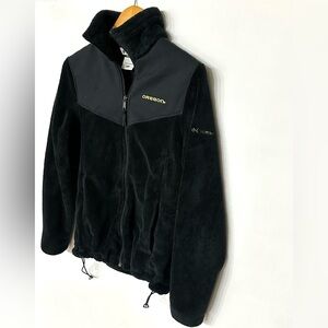Sleek black design with full zip. Ideal for outdoor activities. Features Columbia branding with Oregon Ducks embroidery. Pre-love condition.