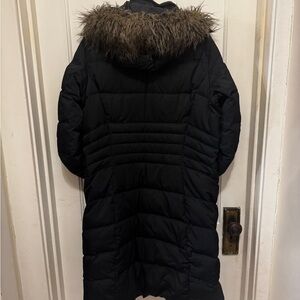 Elegant black puffer jacket by Columbia. Features a stylish faux fur trim. Ideal for cold weather.