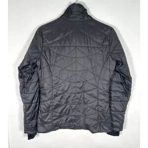 Sleek black puffer jacket. Lightweight and warm. Full zip closure. Ideal for cold weather.