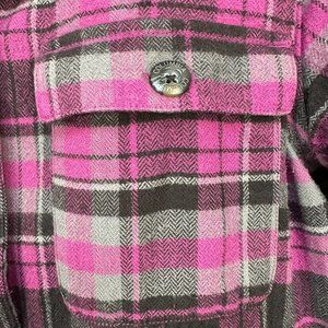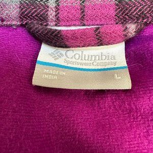Columbia Women's Button Down Plaid Shacket Shirt Jacket, Size Large, Magenta/Gray/Black Plaid Pattern, Shell: 100% Cotton. Lining: 100% Polyester.