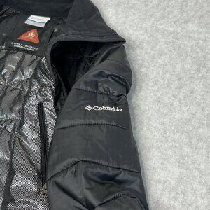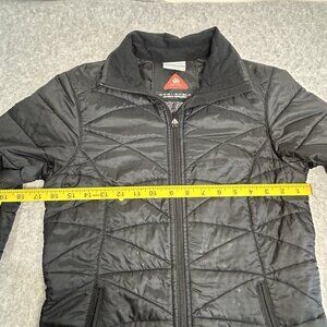 This is a Columbia Women's Down Jacket in size XS, featuring Omni-Heat Shield technology for waterproof protection. The jacket is made of polyester with a solid black color and a short length. It has long sleeves, a zip closure, and polyester blend insulation. The puffer style jacket includes zipped pockets and is suitable for casual outdoor occasions in winter. Please note there are minor flaws present.