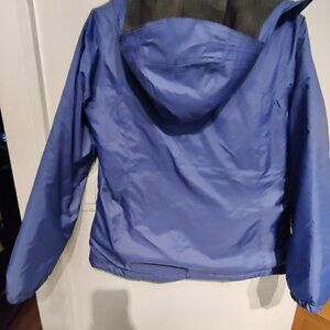 Beautiful Reflective Blue Windbreaker Jacket with black fleece in body and hood. Zippered Closure and Zip Pockets. Adjustible Hood to tighten when the Wind Blows Cold! Elasticized Cuffs. Sz M