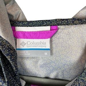 Stay prepared for any adventure with this Columbia lightweight hooded jacket in size Medium. Perfect for light rain or windy days, this jacket features a full front zip closure, adjustable hood, elastic hem, and side pockets. The subtle navy and green dotted pattern is accented with vibrant pink zipper details for a fun, sporty look. Made of 100% polyester and designed for comfort and functionality.