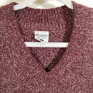 Columbia Women’s Maroon Variegated Long Sleeve V-neck Sweater. Size M. Shoulder to shoulder 16”, armpit to armpit 19”, neck to hem 24”, shoulder to cuff 27.5”. Good used condition.n WSS30