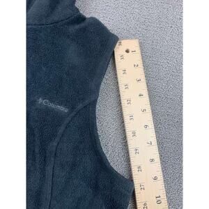 Soft Columbia fleece core vest with stand collar, full-zip front, and zip hand pockets; embroidered chest logo. Ideal mid layer for hiking or casual wear; dark green color. This is single stitch.