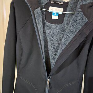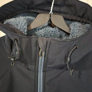 Black soft shell, hooded jacket with fleece lining. Excellent condition, fleece shows no piling. In a couple of the pictures the jacket looks gray, because I used a flash. But it is definitely black.