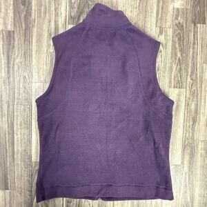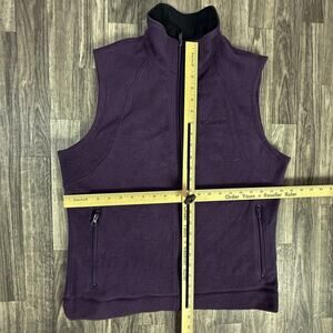 This is a Columbia women’s fleece vest in rich purple color. It features a full-zip front, stand collar, zip hand pockets, and classic fleece construction. Ideal for layering in cool weather or outdoor adventures. Clean and well maintained with no notable flaws.