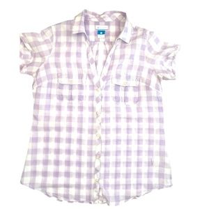 Please see photos for details. Photos are of the actual Columbia Women's Purple and White Plaid Short Sleeve Button Down Shirt