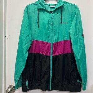 In great condition three color block jacket sporty and water resistant. Attached adjustable hood and zipper front. Side pockets and logo on sleeve.