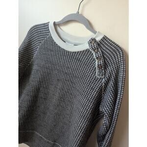 Featuring a classic black and white herringbone pattern, this size large sweater is perfect for adding warmth and texture to any outfit. The comfortable fit and soft fabric make it ideal for everyday wear.