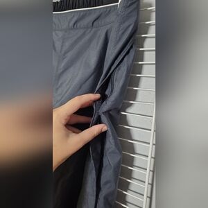 Durable heavy duty snow/ski womens size large pants with well thought out comfort designs. Adjustable velcro waist straps. Zip up pocket at top of waistline inside of pants. Thermal fleece on back of interior of pants that goes down to about the knees.