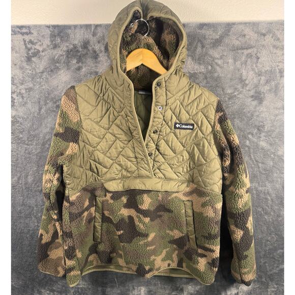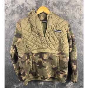 Gently worn and in excellent condition is this Columbia Women's Sweet View Fleece Hooded Pullover Camouflage Large Sherpa 1/4 Snap.