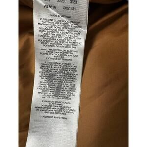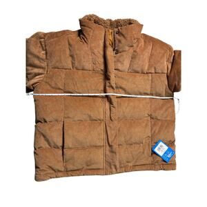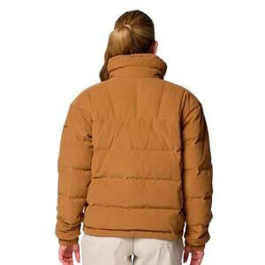 Stylish tan puffer jacket. Warm and comfortable. Perfect for cold weather.