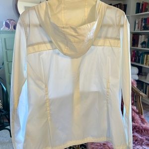 Columbia brand women's lightweight white windbreaker with hidden hood. In very clean condition.
